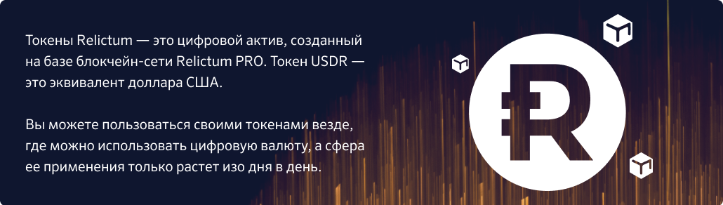Токены Relictum — это цифровой актив, созданный на базе блокчейн-сети Relictum PRO. Мы предлагаем вам несколько видов токенов, которые соответствуют национальным валютам и которые к ним привязаны: токен USDR – эквивалент доллара США.