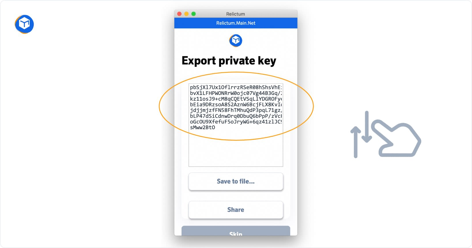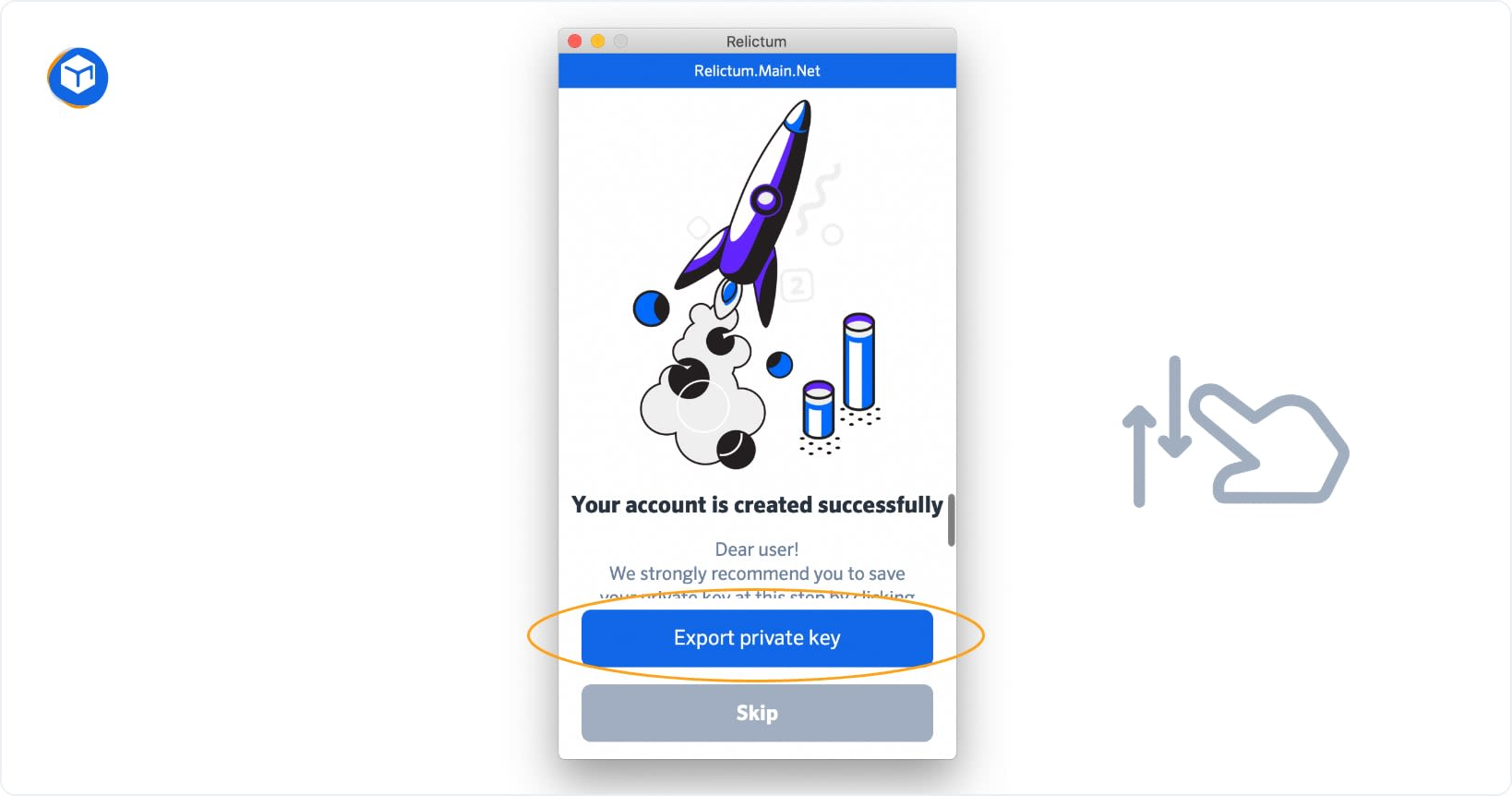 6\. **Внимание!** Команда Relictum Pro настойчиво рекомендует вам сгенерировать закрытый приватный ключ для своего аккаунта, чтобы не потерять к нему доступ в дальнейшем. Просто нажмите кнопку Export private key.
