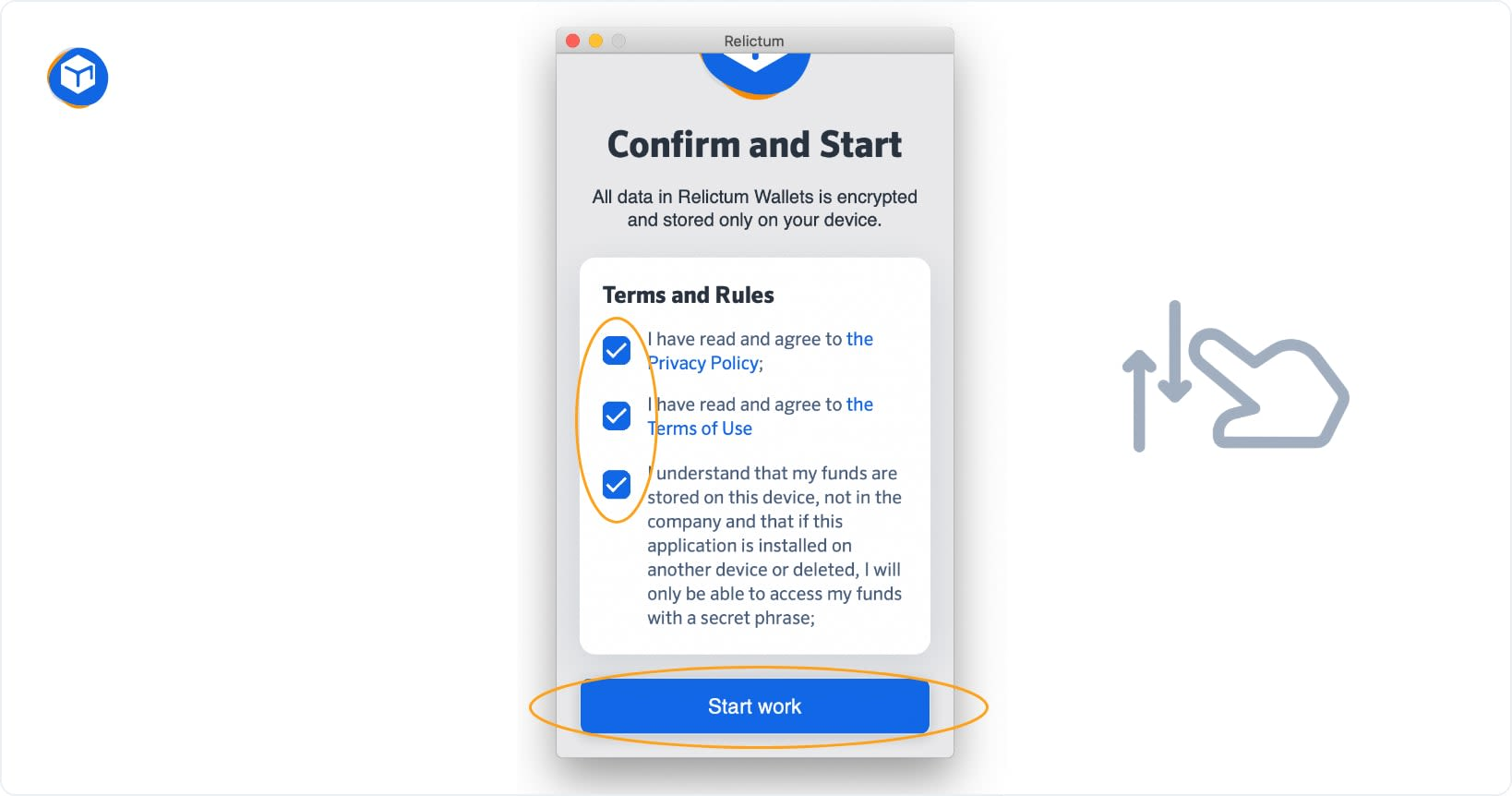 2\. После первого запуска вы увидите ознакомительную информацию для работы с приложением, а для начала работы с нодой, вам необходимо будет ознакомится с правилами и подтвердить свое согласие с ними.